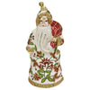 • Unique Hand Painted Red and Green Holiday Floral White Coat Santa Ornament Holding a Red and Gold Glitter Sack of Presents