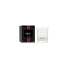 Housed in a glass vessel etched with elegant, frosted stripes to complement any decor.
